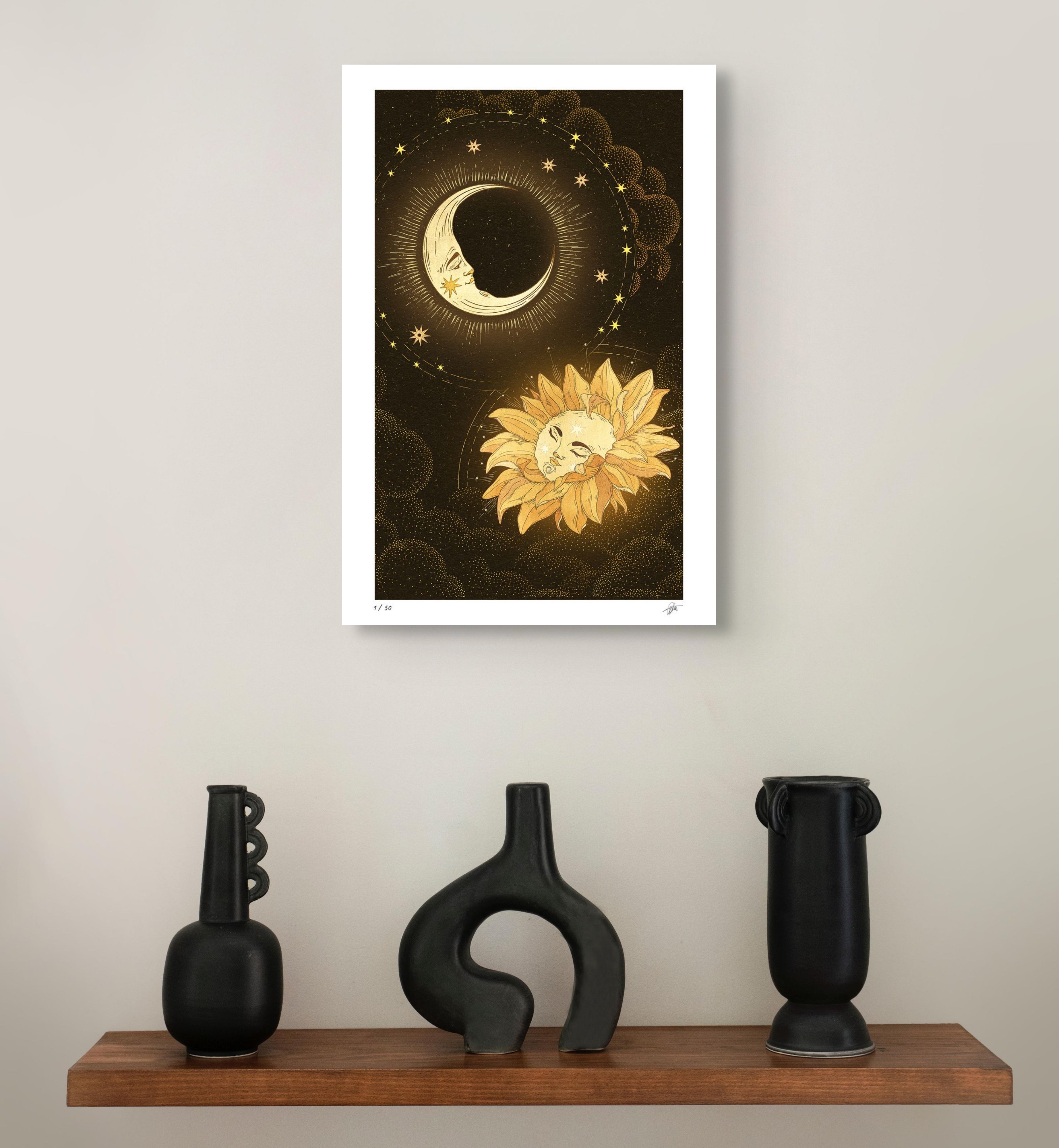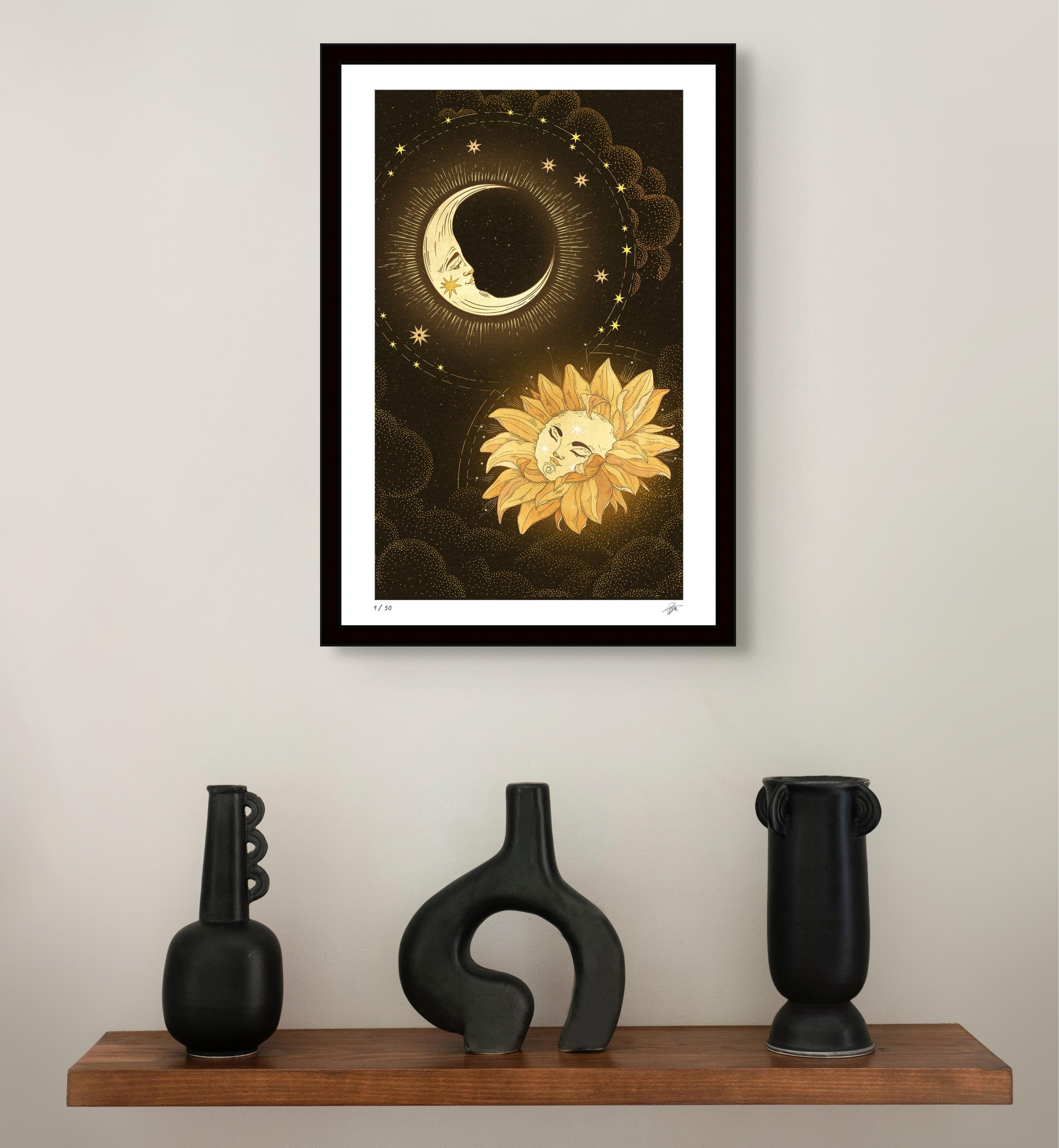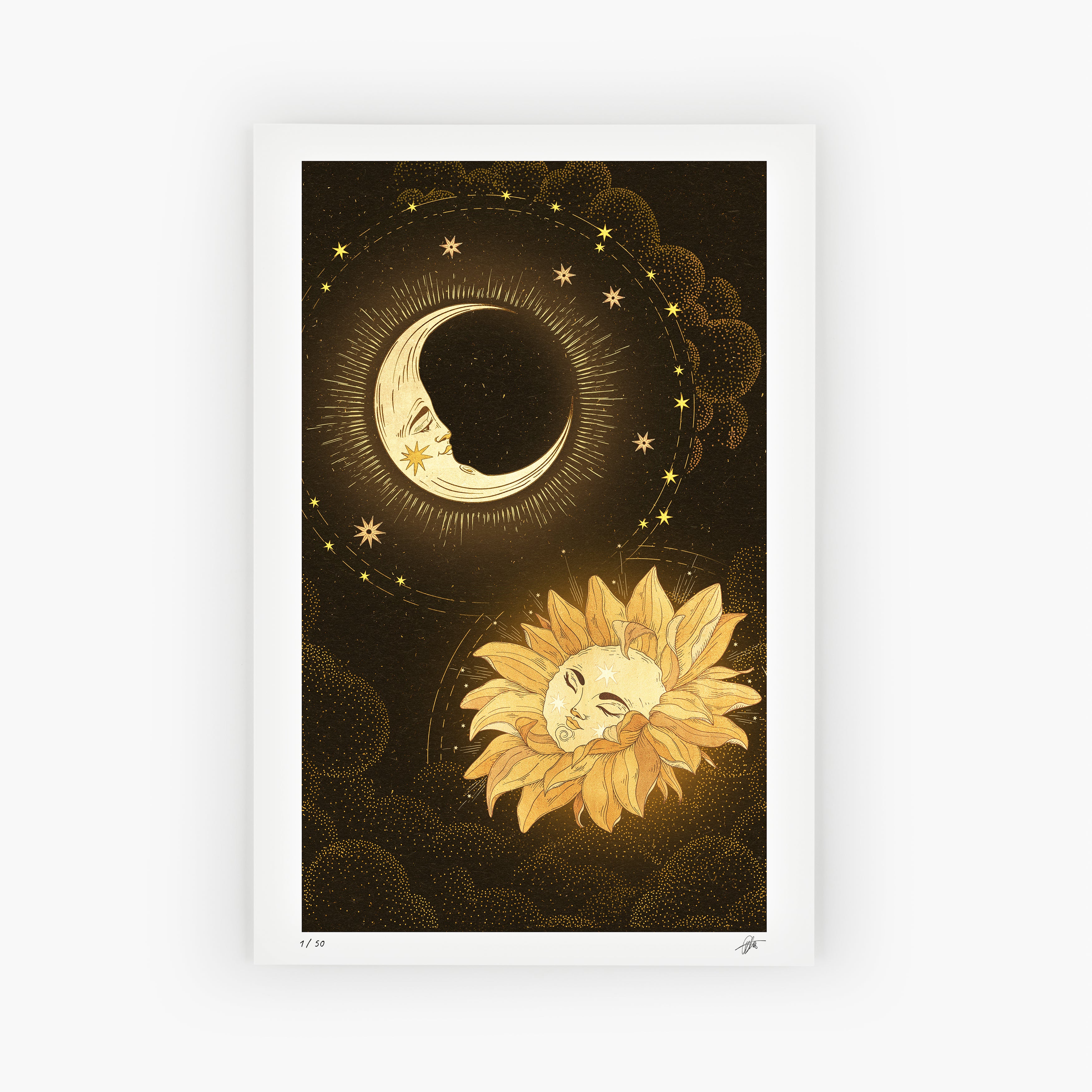 The sun and moon meet in a soft golden bloom, drifting toward each other like