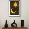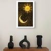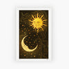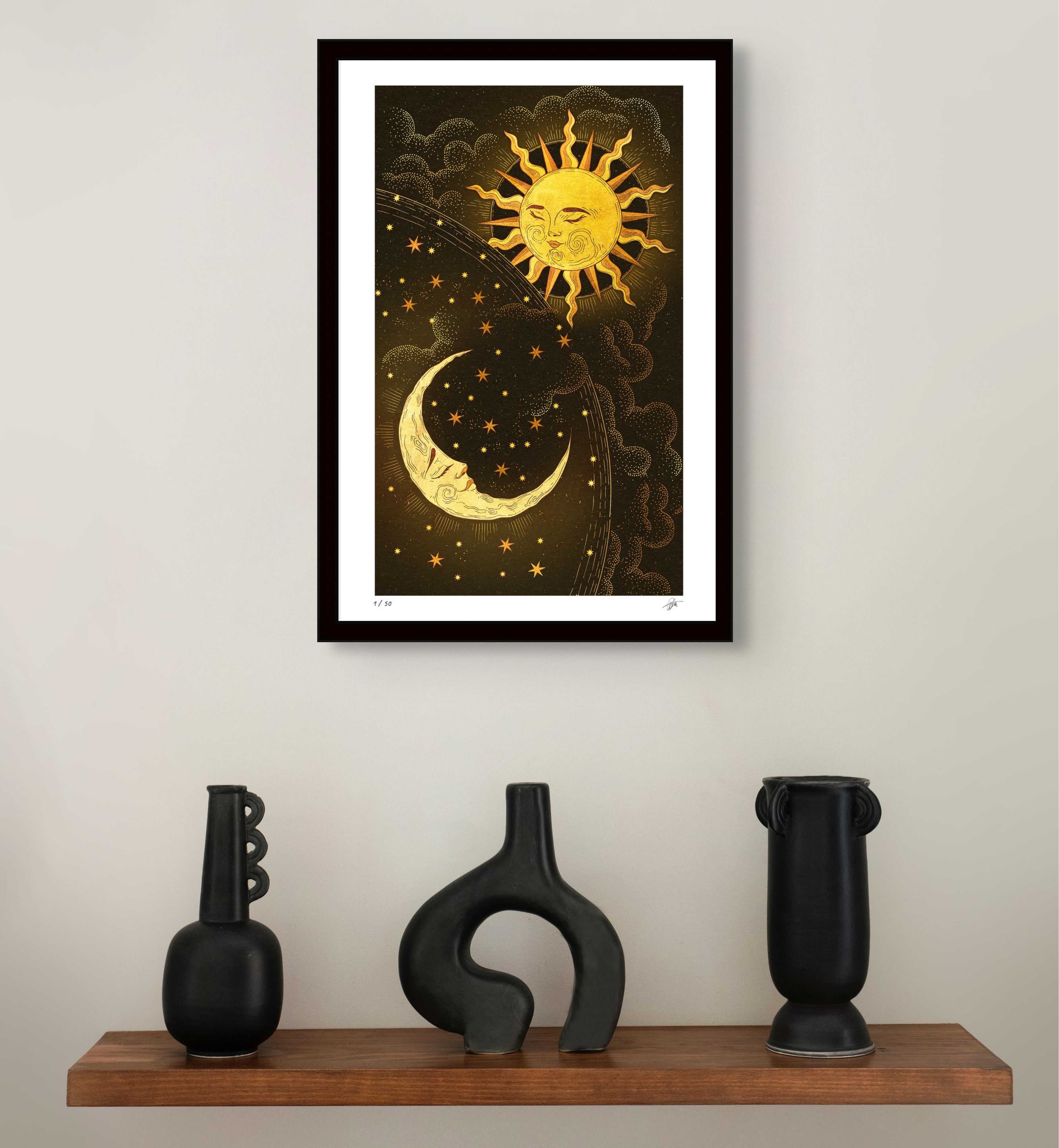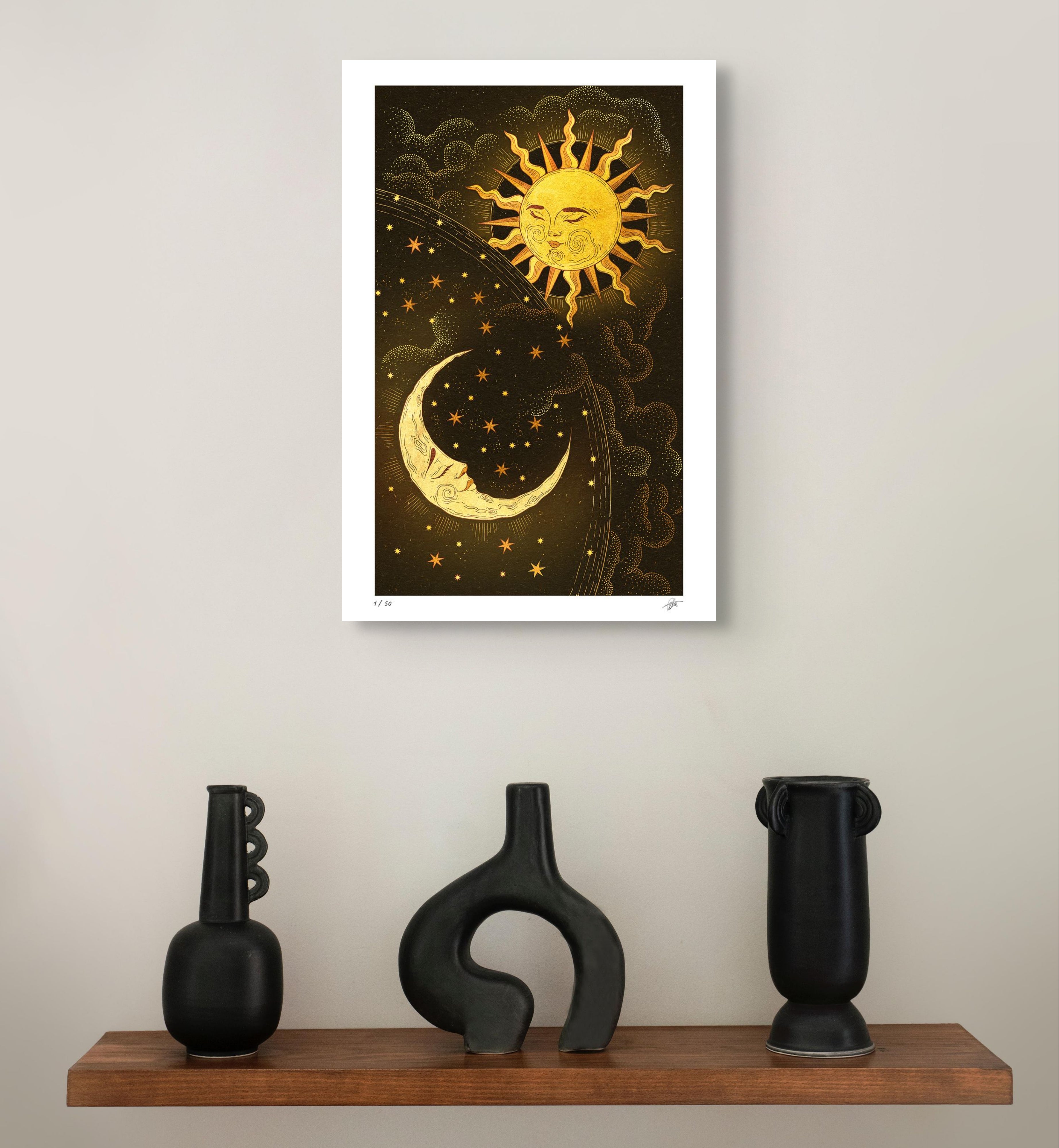 The sun watches from above as the moon drifts through a sky full of stars, a